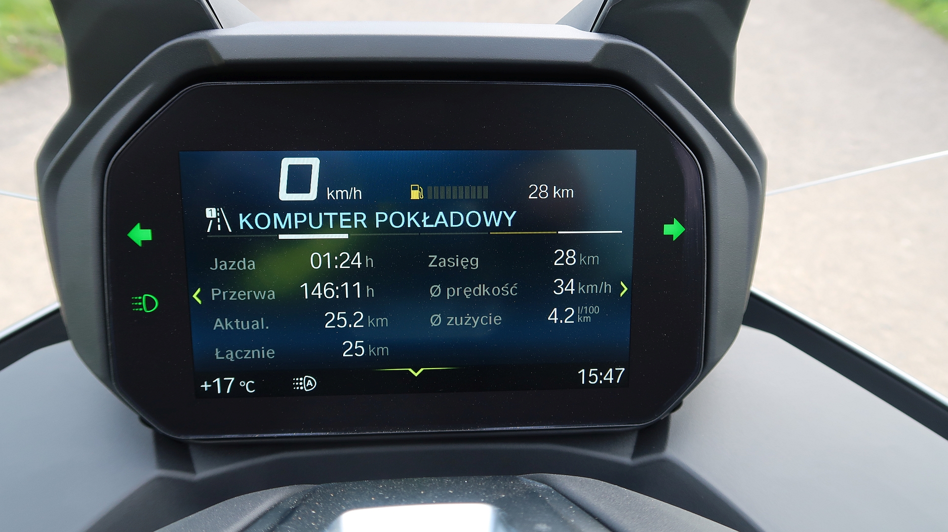 Skuter C400 GT wyposażono w ulubiony przeze mnie 6,5", matowy, kolorowy wyświetlacz TFT w którym znajduje się centrum informacji o motocyklu, podczas jazdy można wybrać kilka różnych okien wyświetlania parametrów w tym prędkość wraz z obrotomierzem, komputer pokładowy czy ogólne ustawienia, gdzie możemy modyfikować i odczytać wszelkie parametry pracy silnika w tym średnie spalanie, temperaturę silnika, zasięg i wiele innych.