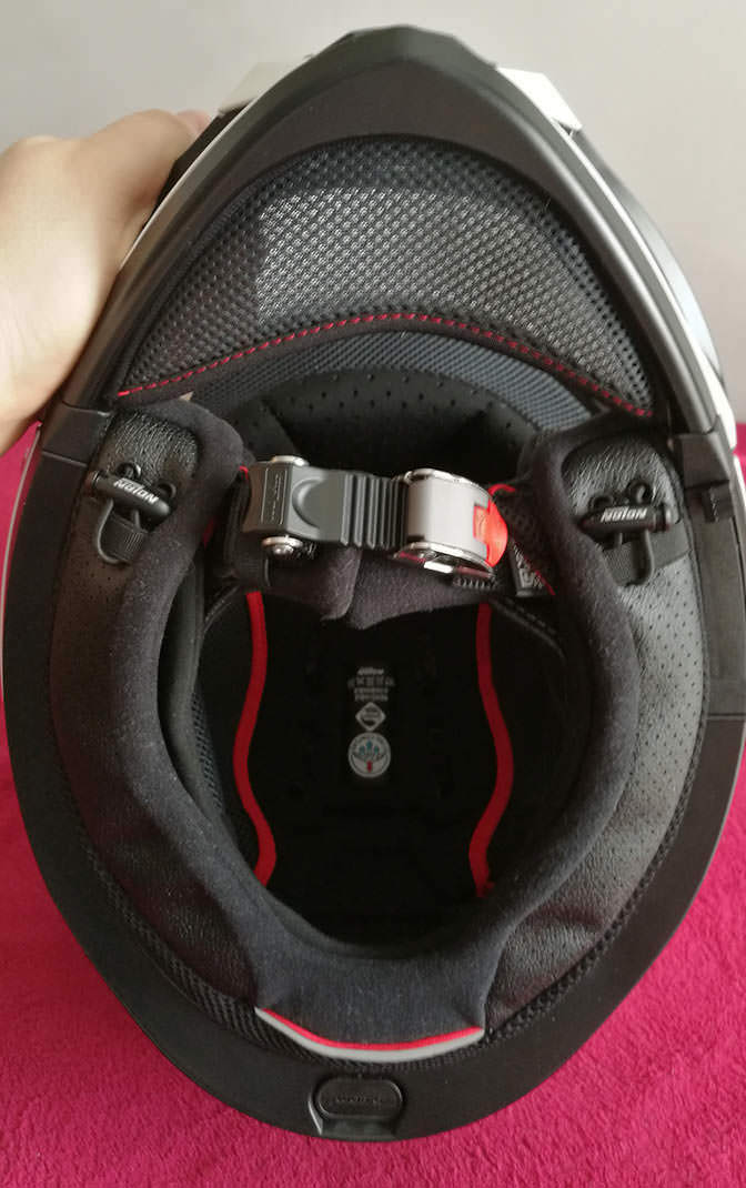 Wnętrze kasku zrobione jest z antyalergicznej wyściółki Clima Comfort Top. Wnętrze jest w pełni wyjmowane z możliwością wyprania wyściółki. Kask zaopatrzony jest w dodatkową w pełni wyjmowaną ochronę karku. Dodatkowo zewnętrzna część wyściółki zaopatrzona jest system regulacji umożliwiający ścisłe dopasowanie jej do obwodu szyi i dzięki temu zapobieganiu podwiewaniu powietrza do wnętrza od dołu. Muszę przyznać że po założeniu kask jest dość wygodny. Na pewno dużo wygodniejszy od trochę twardawego AGV Compact, którego używałem do tej pory.