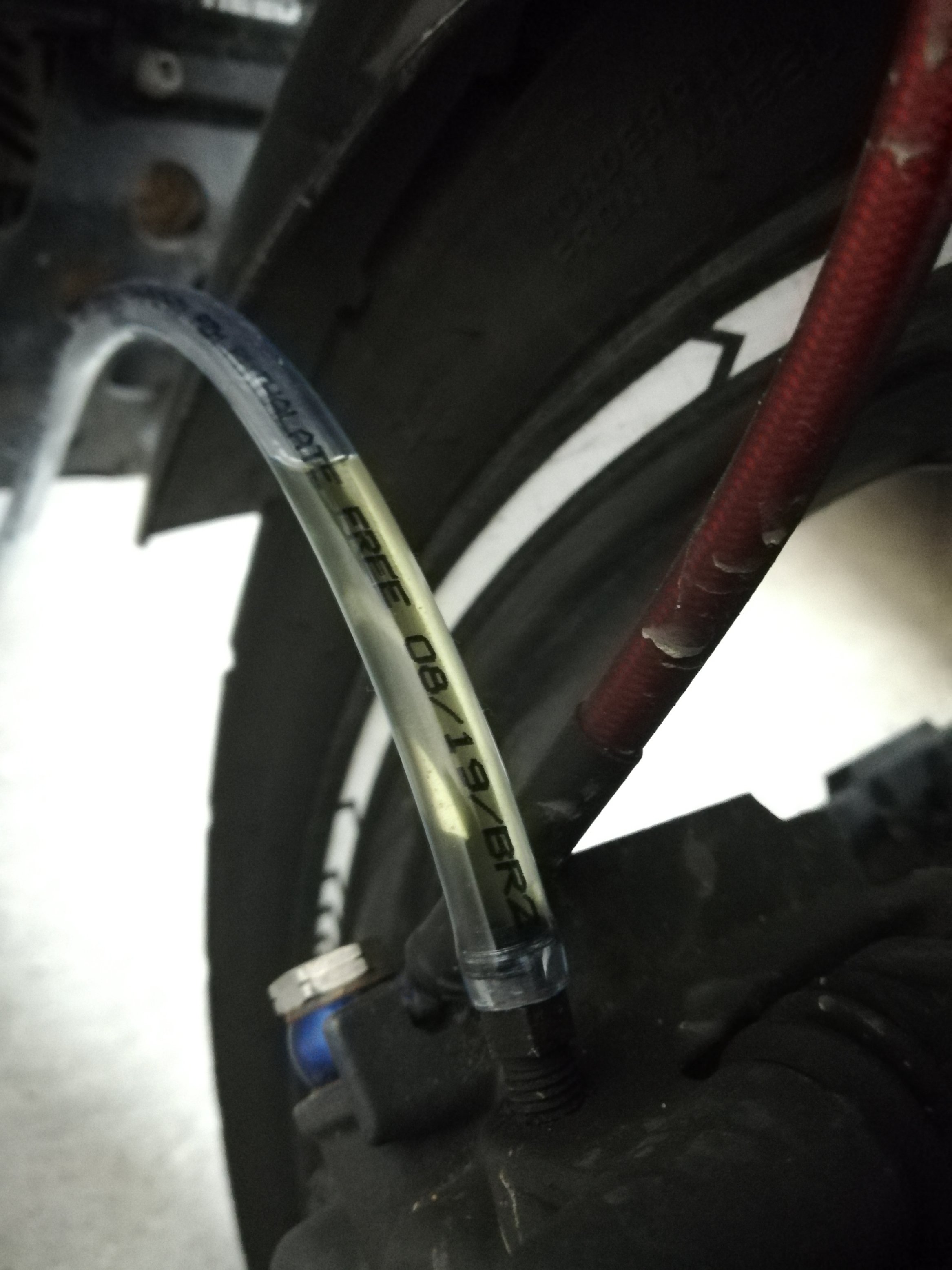 lewego zacisku koła przedniego, spodziewałem się ciemnej cieczy a wyszło na początku coś prawie przeźroczystego