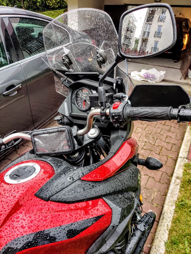 Jak na etui na telefon za 40 zł i obejmę 12 mm za 1,20 zł efekt jest całkiem zadowalający. Etui dolega do szyby i pałąka na tyle na ile może. Z normalnym mocowaniem najpewniej odstawałoby na kilka cm, a z pałąkiem wepchanym za uchwyt Givi jest jak należy.