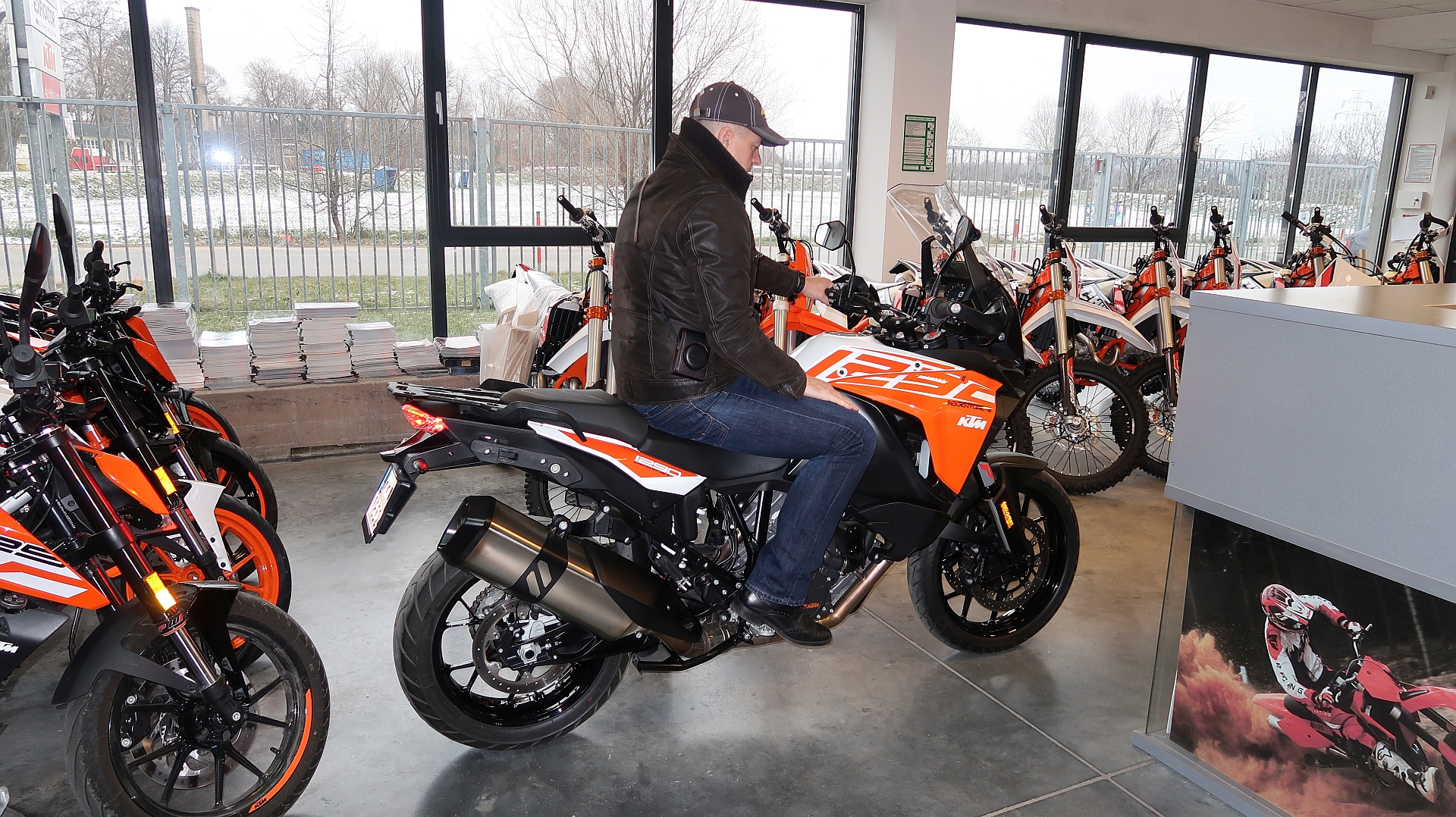 Podczas przymiarki do tego motocykla poprosiłem dealera by zrobił mi parę zdjęć, widać na nich iż KTM 1290 Super Adventure S będzie wygodny ale tylko dla osób wyższych, przy moim wzroście (184 cm.) dotykałem do ziemi na lekko ugiętych stopach, oczywiście w obuwiu motocyklowym byłoby nieco wyżej, ale siedzenie było już maksymalnie obniżone (jego standardowa wysokość to 860 mm.)